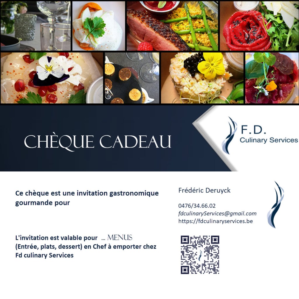 Avec le chèque-cadeau de F.D. Culinary Services… Vous choisissez le montant et l’heureux bénéficiaire pourra déguster une cuisine gastronomique en chef à emporter ou en chef à domicile selon sa préférence.