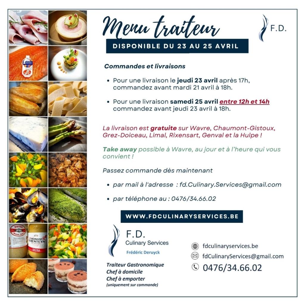 Pour commandez, envoyez simplement un mail à fdculinaryservices@gmail.com en mentionnant pour une première commande votre nom, prénom, numéro de téléphone, adresse et le jour de livraison souhaité. La commande sera validée par un mail de retour. ou téléphonez au 0476/34.66.02