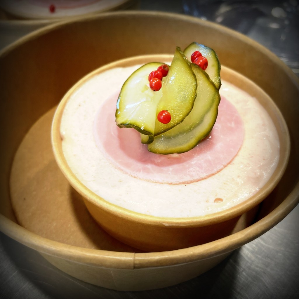 Une mousse de jambon blanc du pays, légère et onctueuse, travaillée pour révéler toute la douceur et la gourmandise du produit. Elle est délicatement nappée d’une gelée au porto, qui apporte une touche subtilement parfumée et légèrement sucrée, venant équilibrer parfaitement l’ensemble.