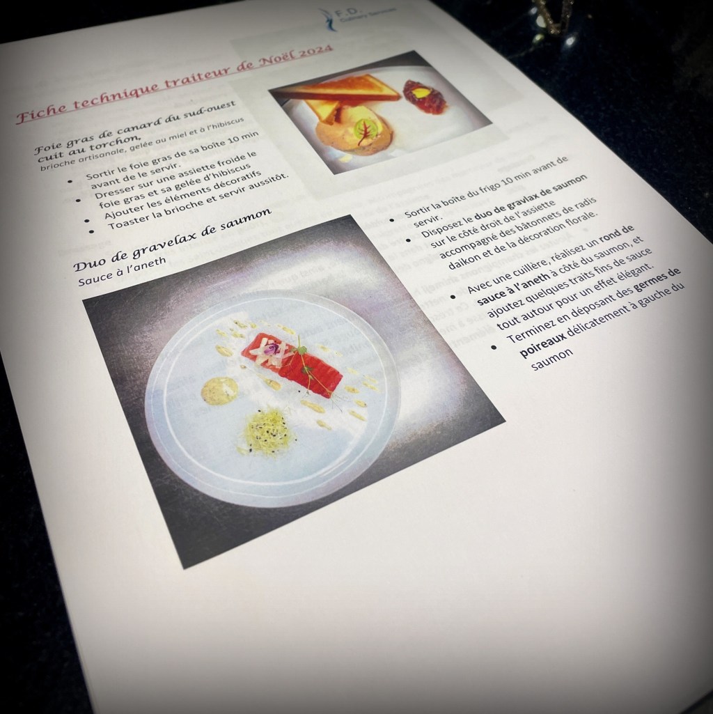 Parce qu’un repas de fête mérite aussi une belle mise en scène, chaque menu est accompagné d’une fiche technique détaillée — simple et claire — pour vous guider pas à pas dans le réchauffage et le dressage de vos plats.