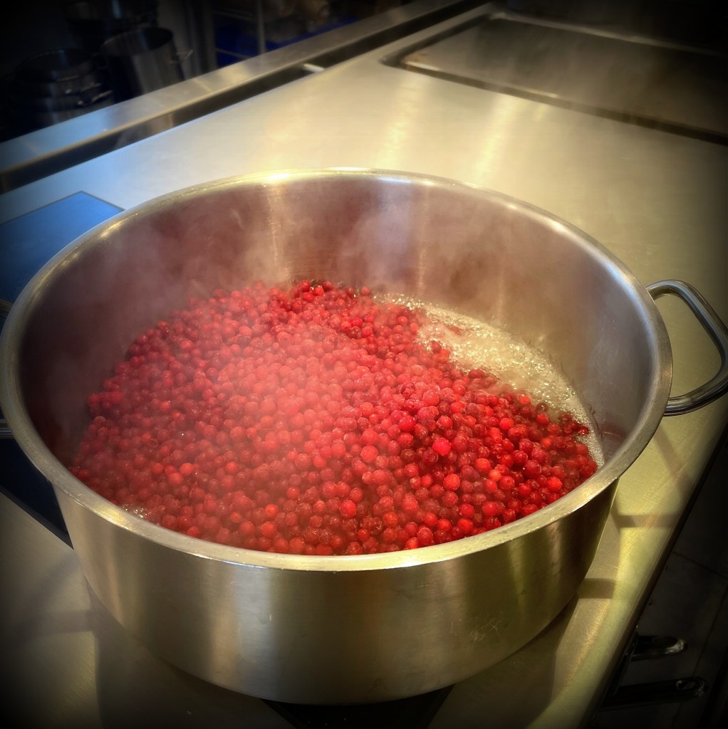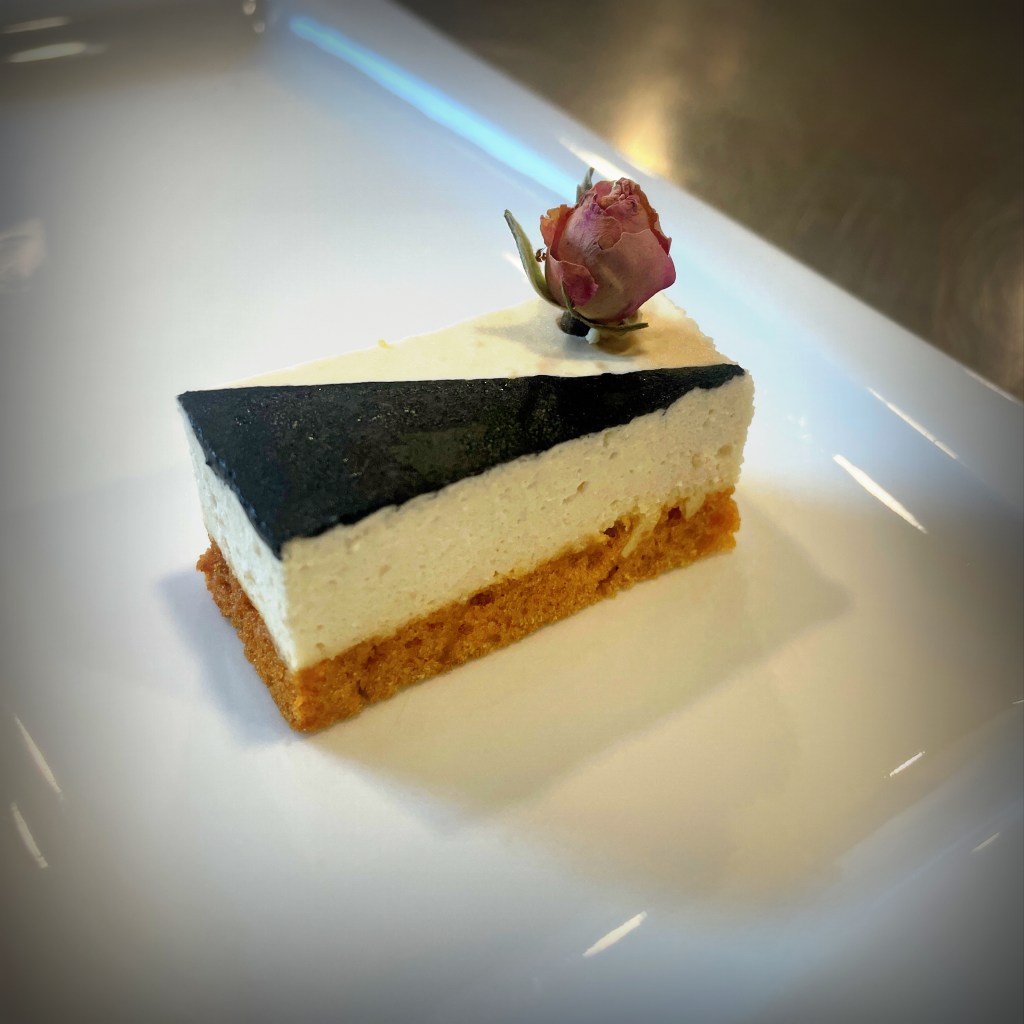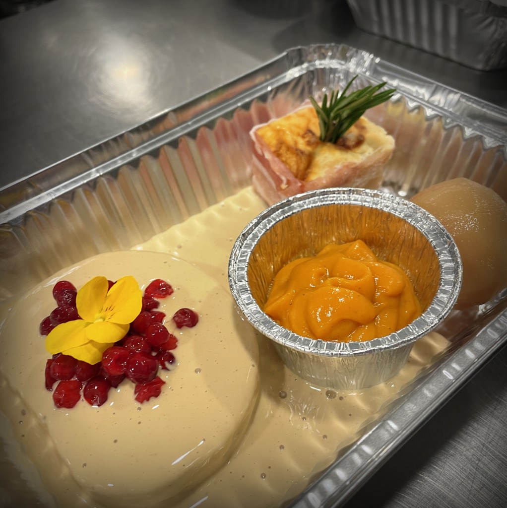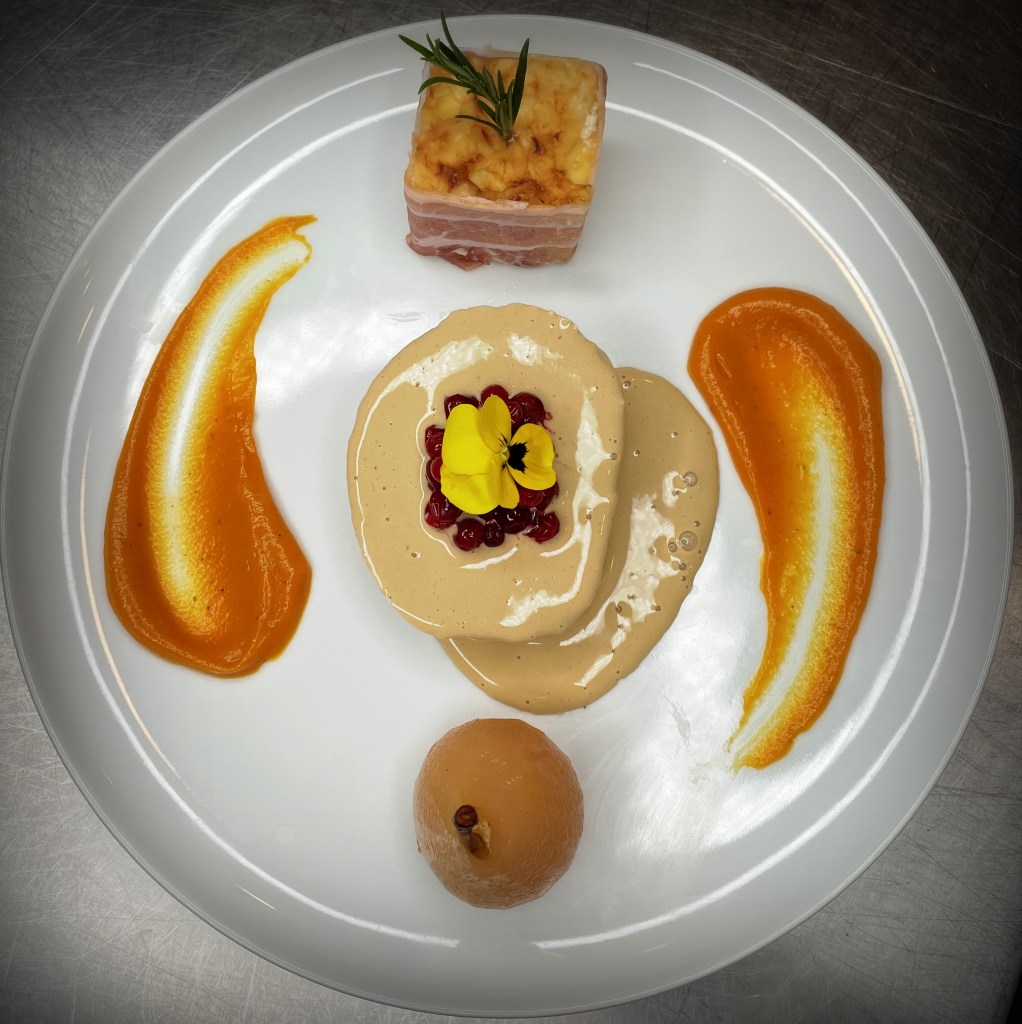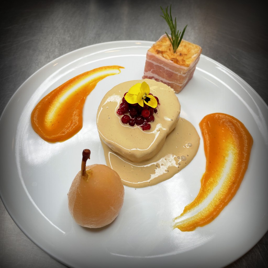 Il est accompagné d’un gratin dauphinois crémeux comme on l’aime, d’une poire pochée aux épices qui apporte une touche fruitée et chaleureuse, et d’une crème d’airelles au cognac pour relever l’ensemble avec élégance.