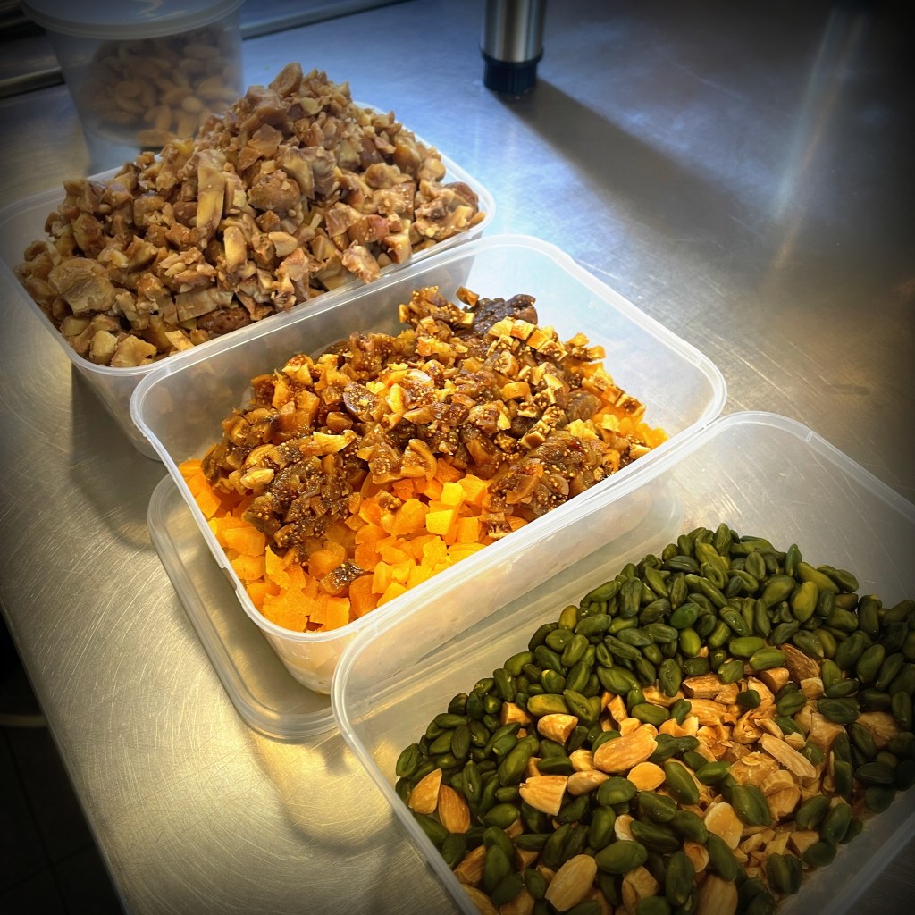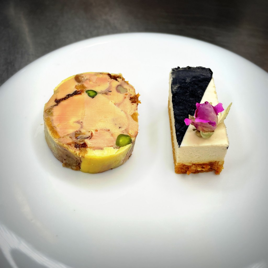 Cette nougatine de foie gras aux fruits secs révèle un équilibre subtil entre douceur, croquant et fondant, sublimé cette année par un délicat gâteau de cacahuètes et un pain d’épices moelleux.
