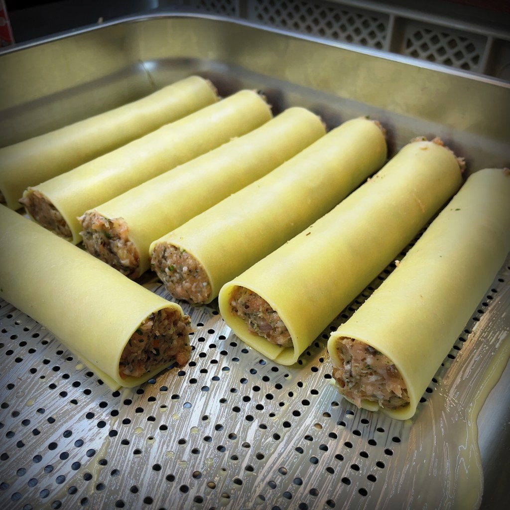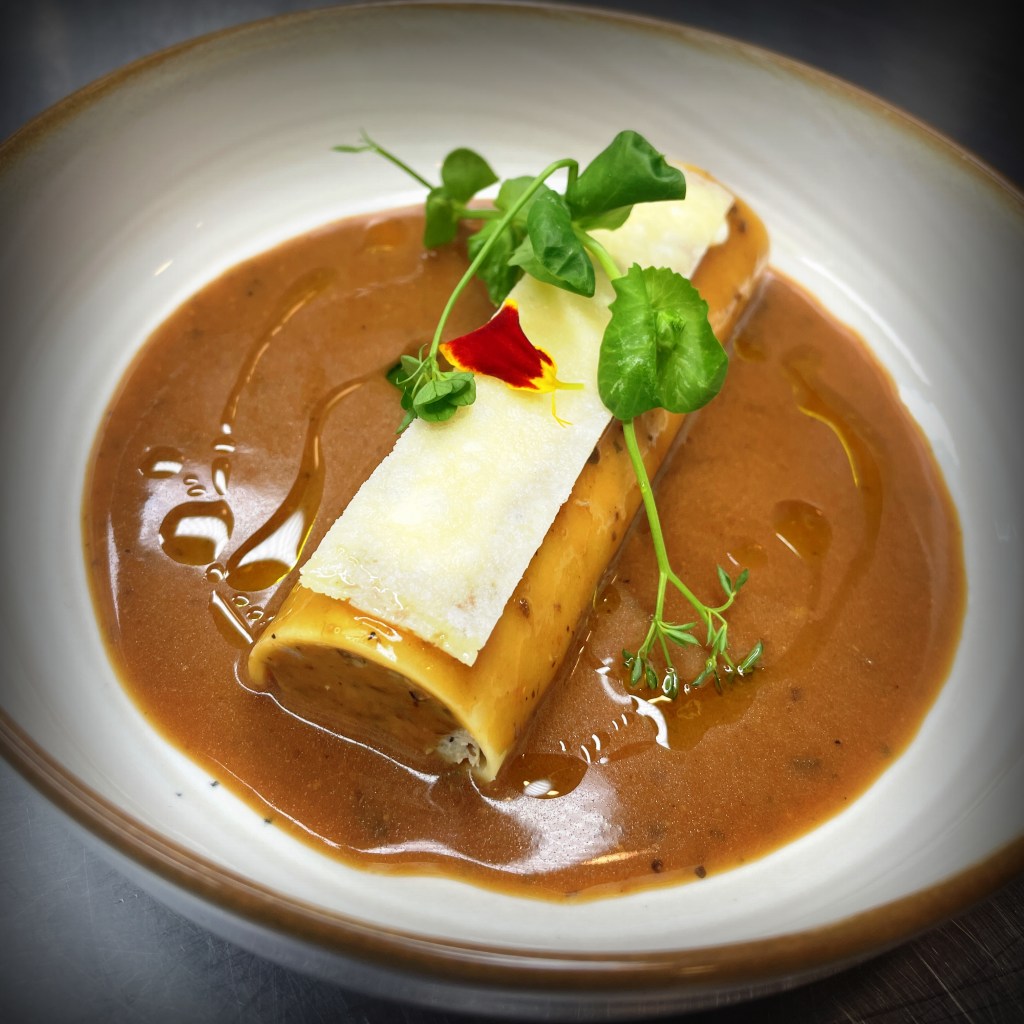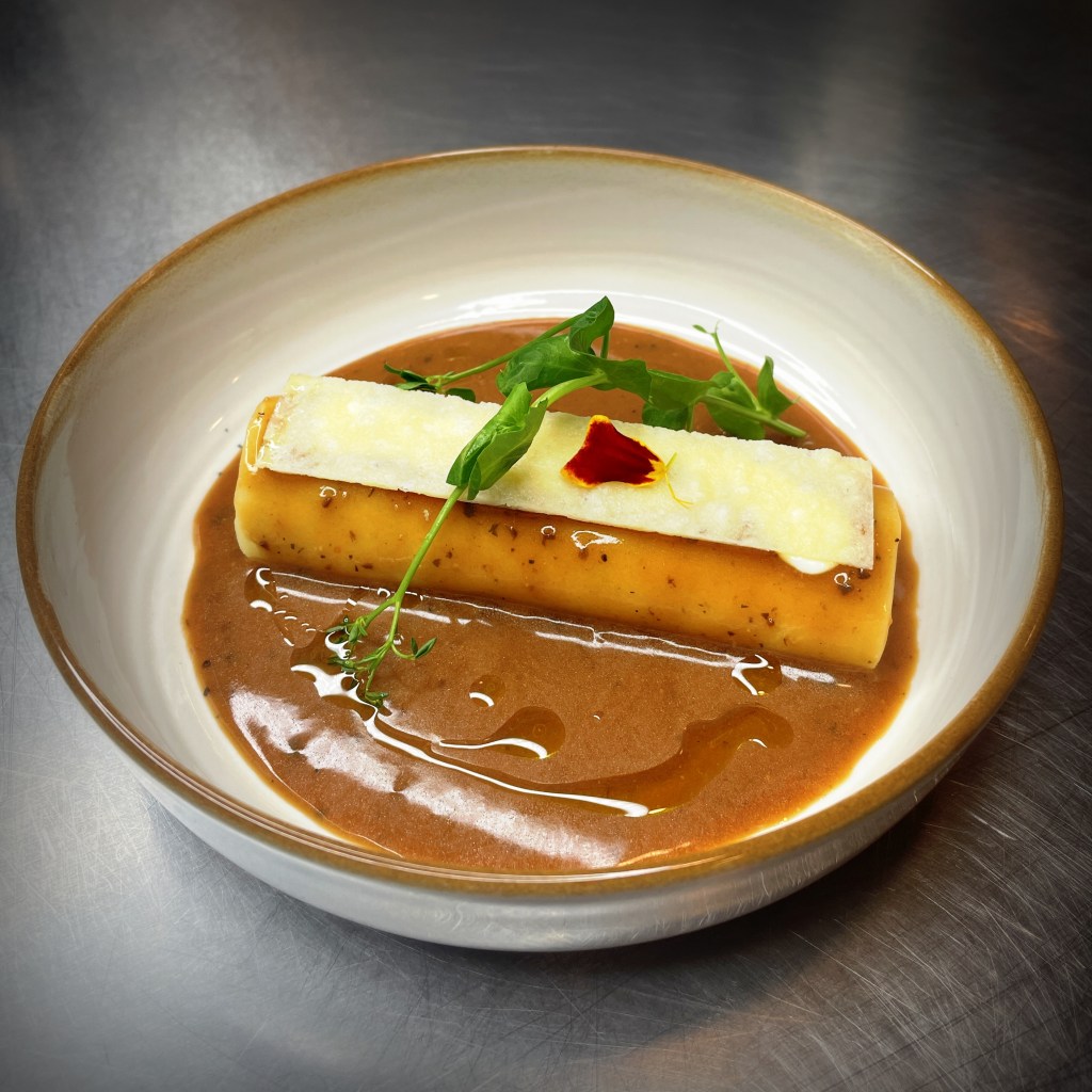 Une entrée généreuse et raffinée : un cannelloni farci d’un mélange fondant de veau et de champignons des bois, relevé d’une touche de truffe pour encore plus de gourmandise.