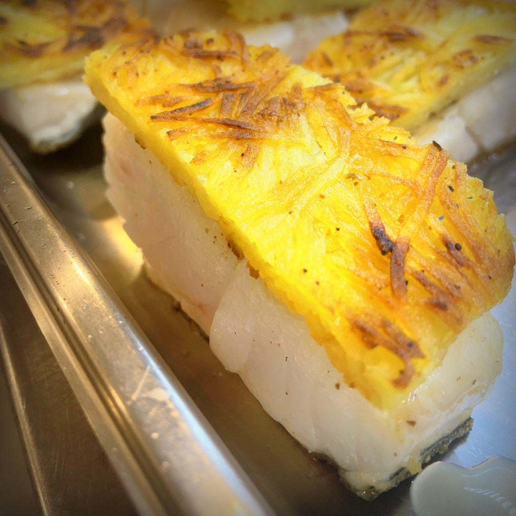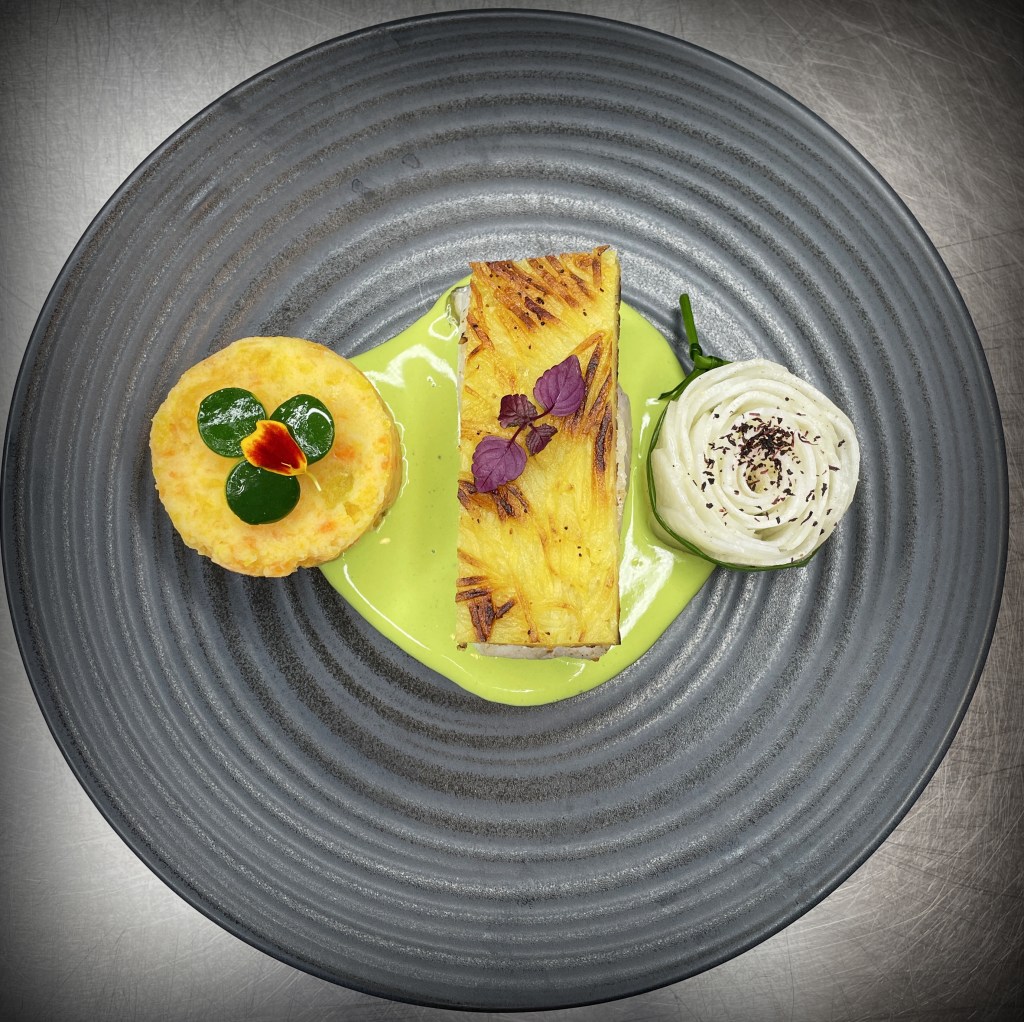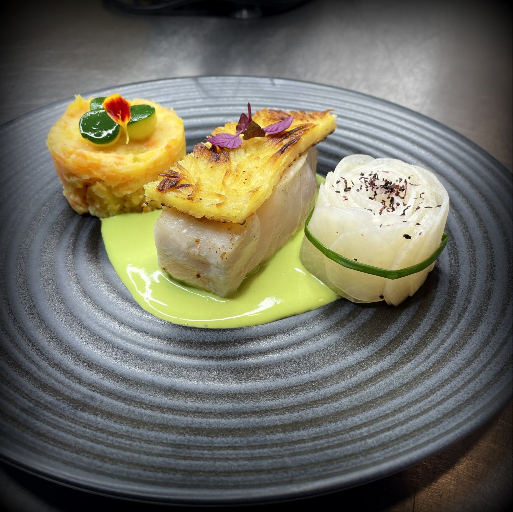 Un plat délicat et lumineux : un dos de cabillaud fondant, recouvert d’une fine croûte de pomme de terre croustillante.