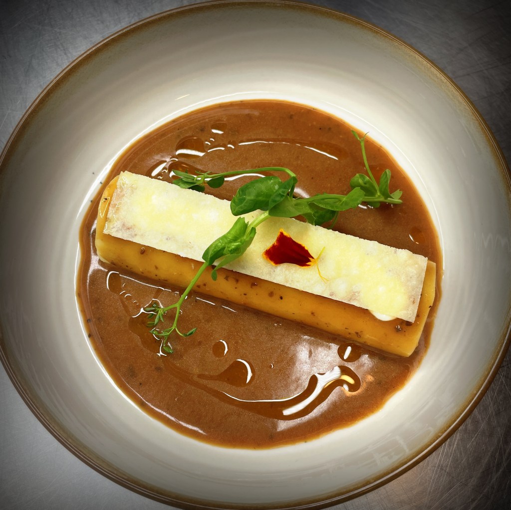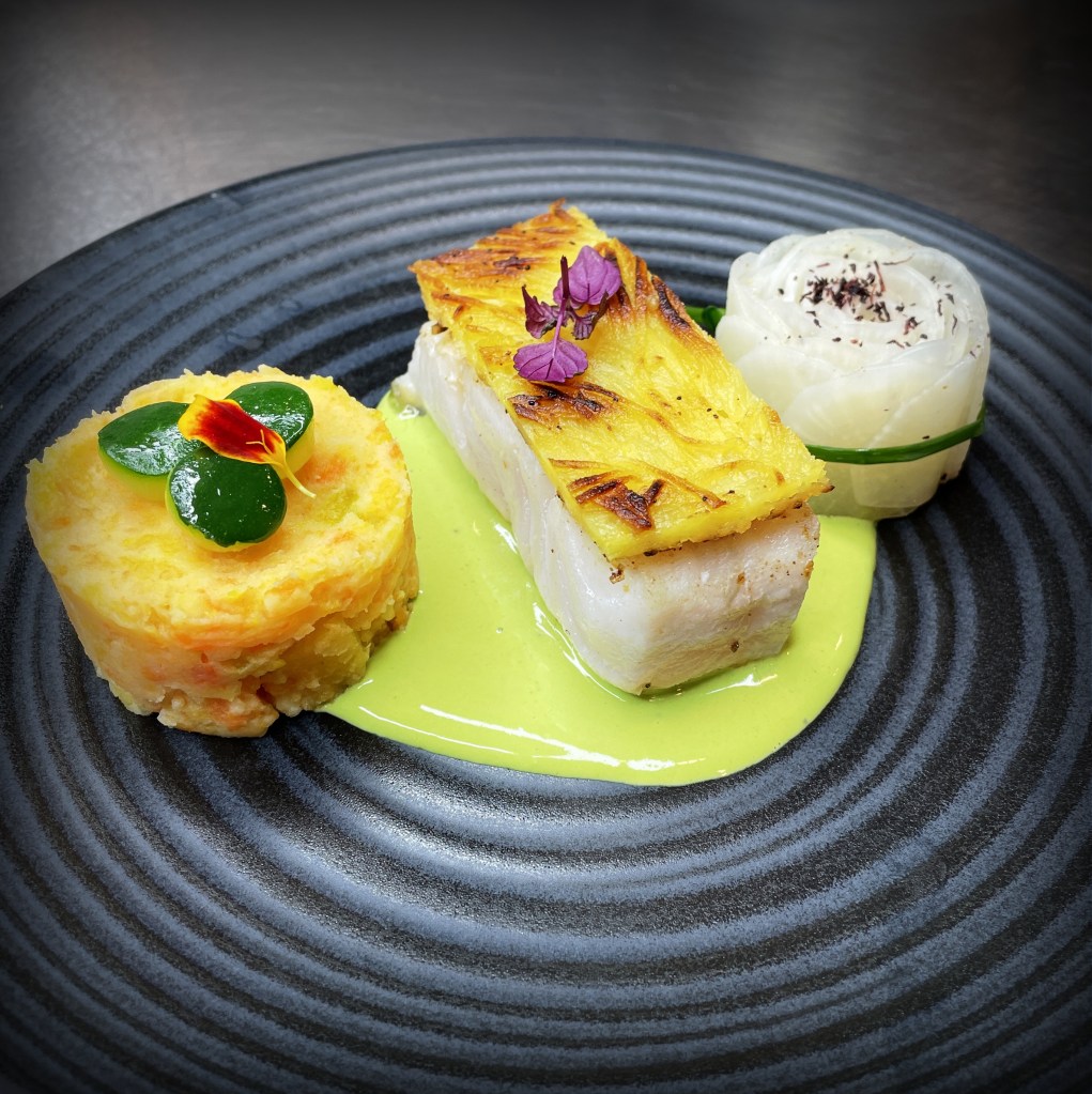 Il est accompagné d’un beurre blanc au champagne et au cresson, à la fois frais et élégant, ainsi que d’un écrasé de carottes au cumin qui apporte une touche légèrement épicée et chaleureuse.