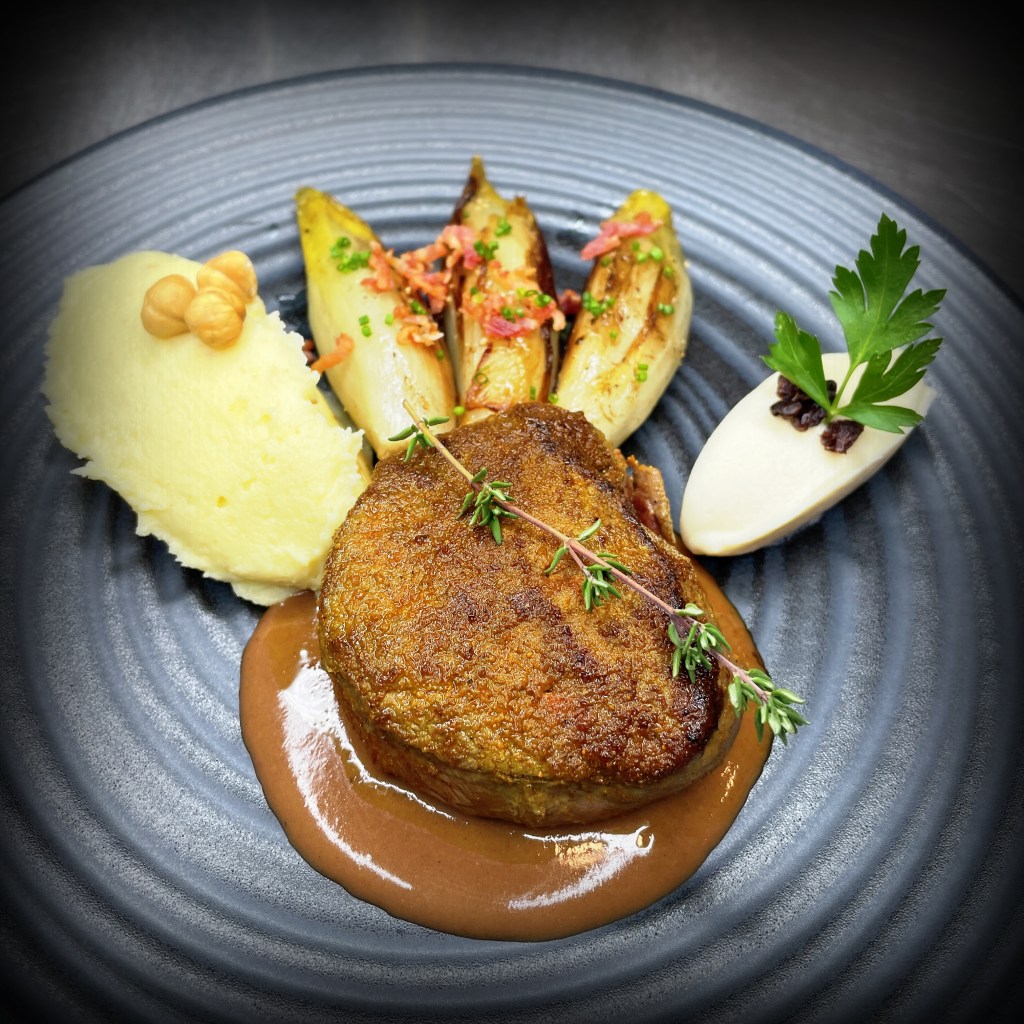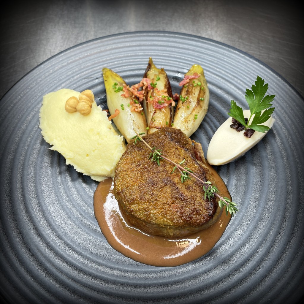 Dernier plat de gibier de l’année tout en finesse : un filet de biche saisi au sautoir, tendre et parfumé, servi avec une chiconette poêlée qui apporte une légère amertume très équilibrée.