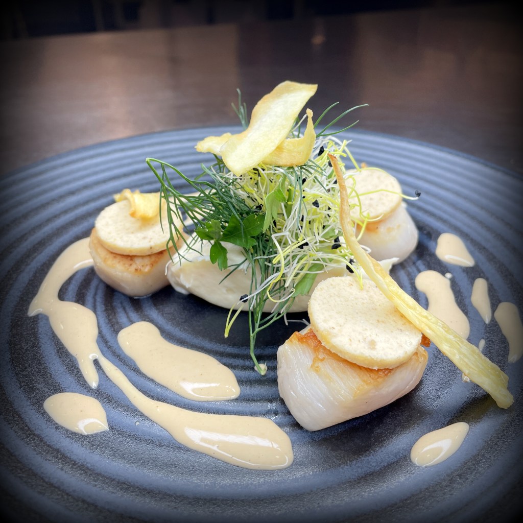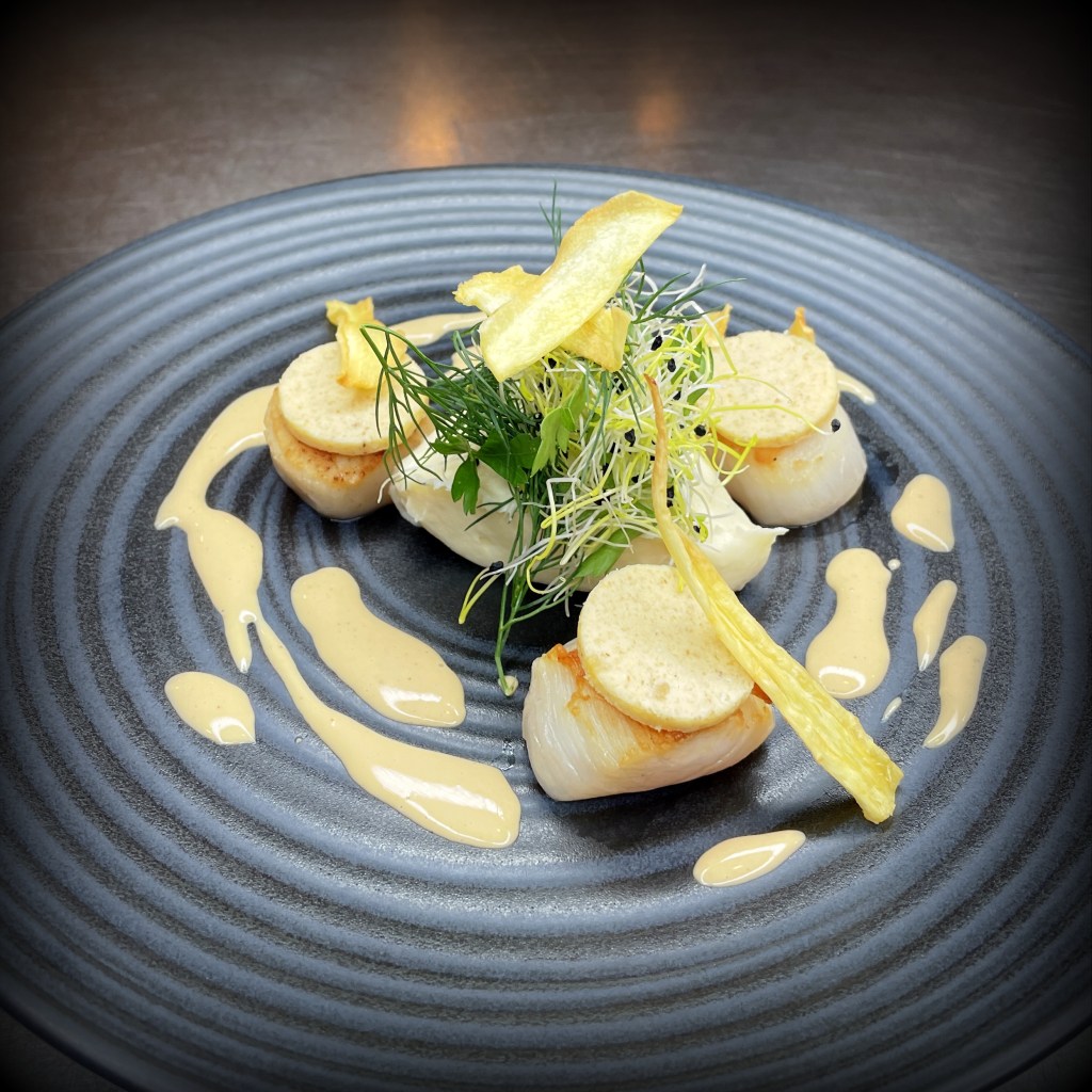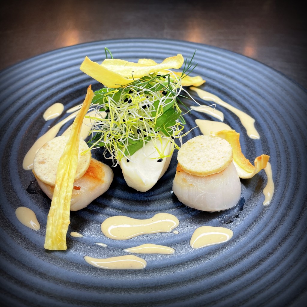 Mousseline de céleri, chips de panais et sauce vin jaune (supp 5€ au menu) – (26€*)