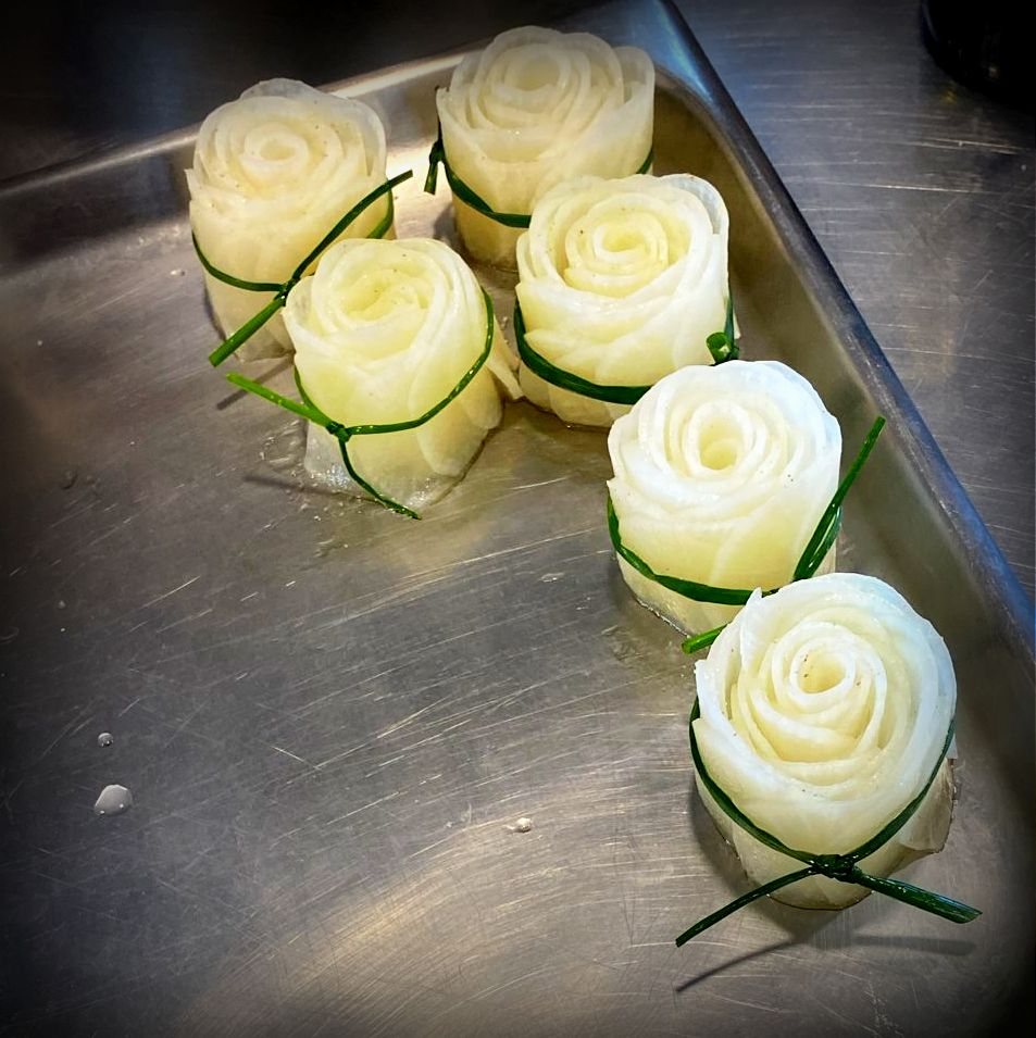Une petite fleur de daïkon vient compléter l’assiette avec une note croquante et poivrée.
